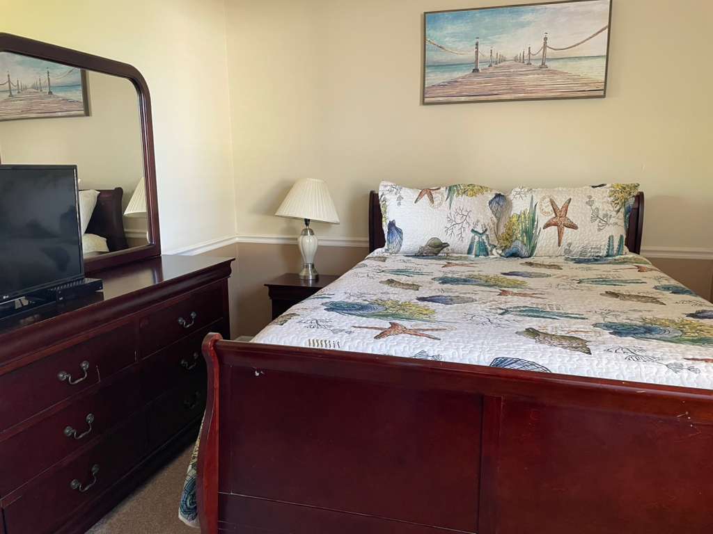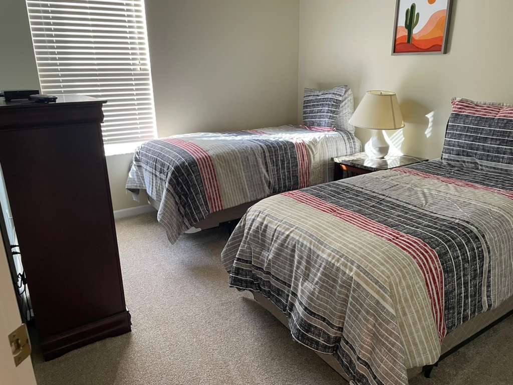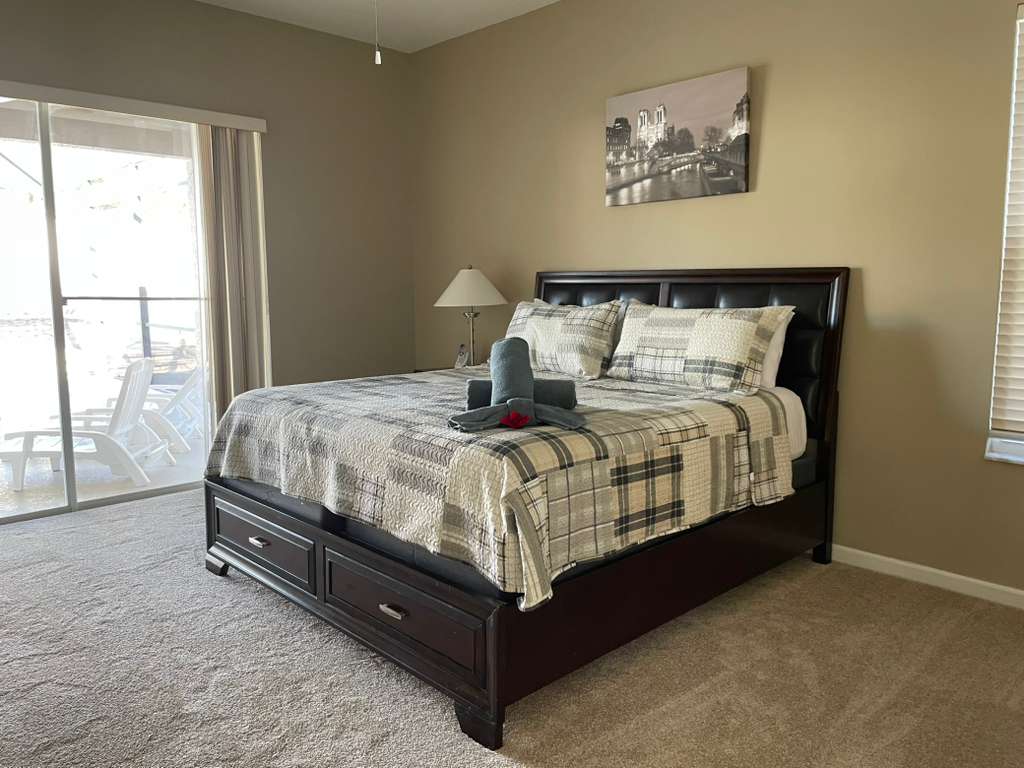 The large Master King Bedroom has its own Ensuite spacious bathroom with two sinks, a walk-in shower, tub and separate toilet. There is a walk-in closet for your clothes and a Smart TV too for ultimate relaxation whilst on vacation! There is access to the pool deck via patio doors from the Master Bedroom.