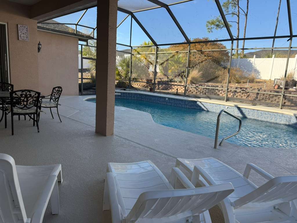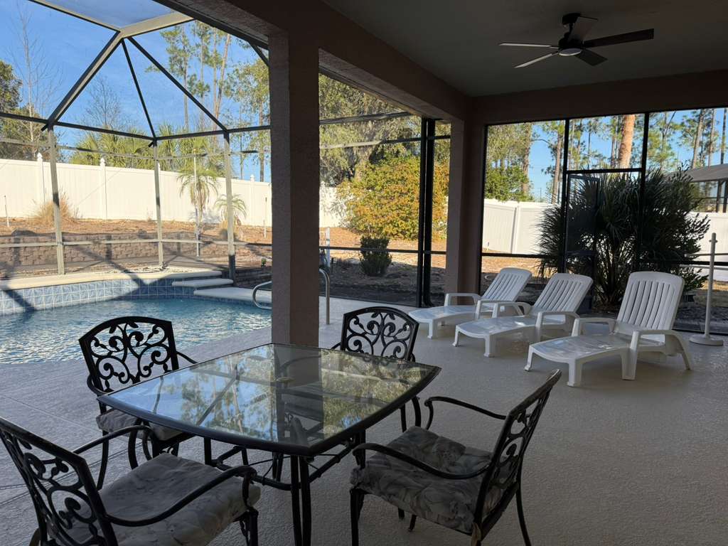 The very large pool deck with covered lanai can be accessed from the Breakfast nook area via patio doors. Here you can sit and enjoy an Al Fresco drink or meal - there is a table and 4 chairs in this area and 3 sun loungers. The pool itself will be a welcome place to relax after your long day in the Floridian sunshine.