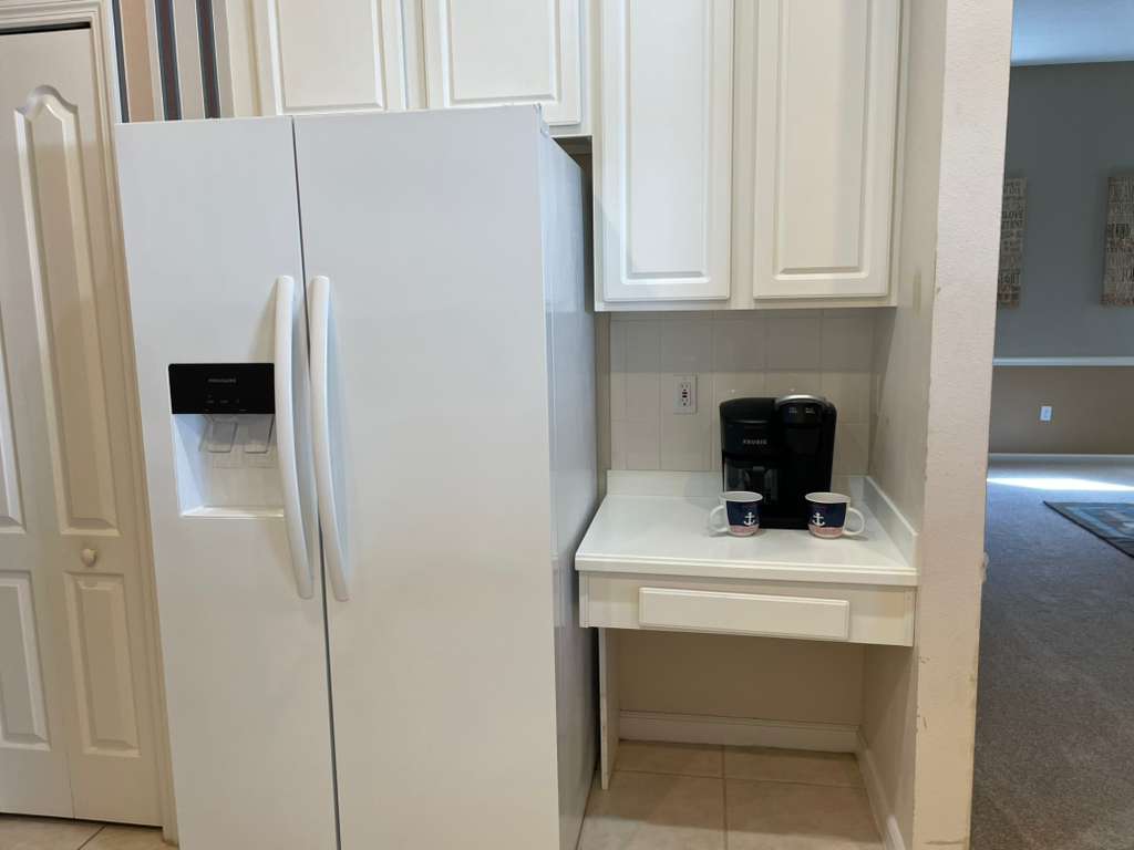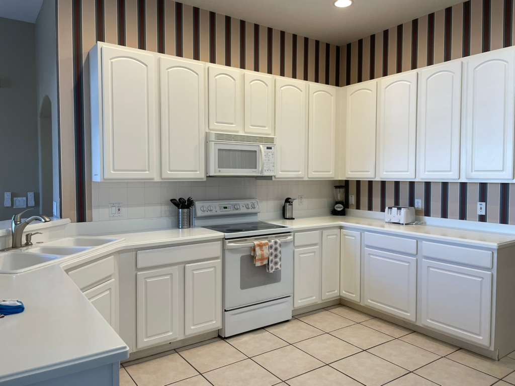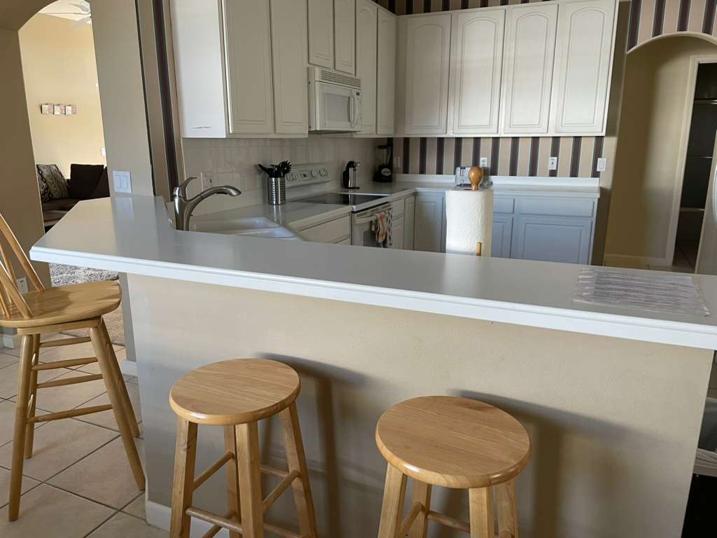 The kitchen is fully fitted and has a Keurig coffee maker, dishwasher, oven, stove top, microwave for you to whip up a quick snack or a gourmet meal. The breakfast var has 4 stools and there is a 6 person breakfast nook table with views over the pool area.