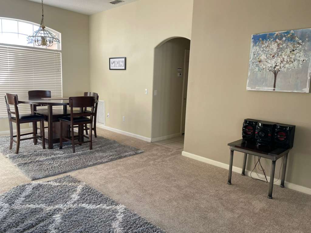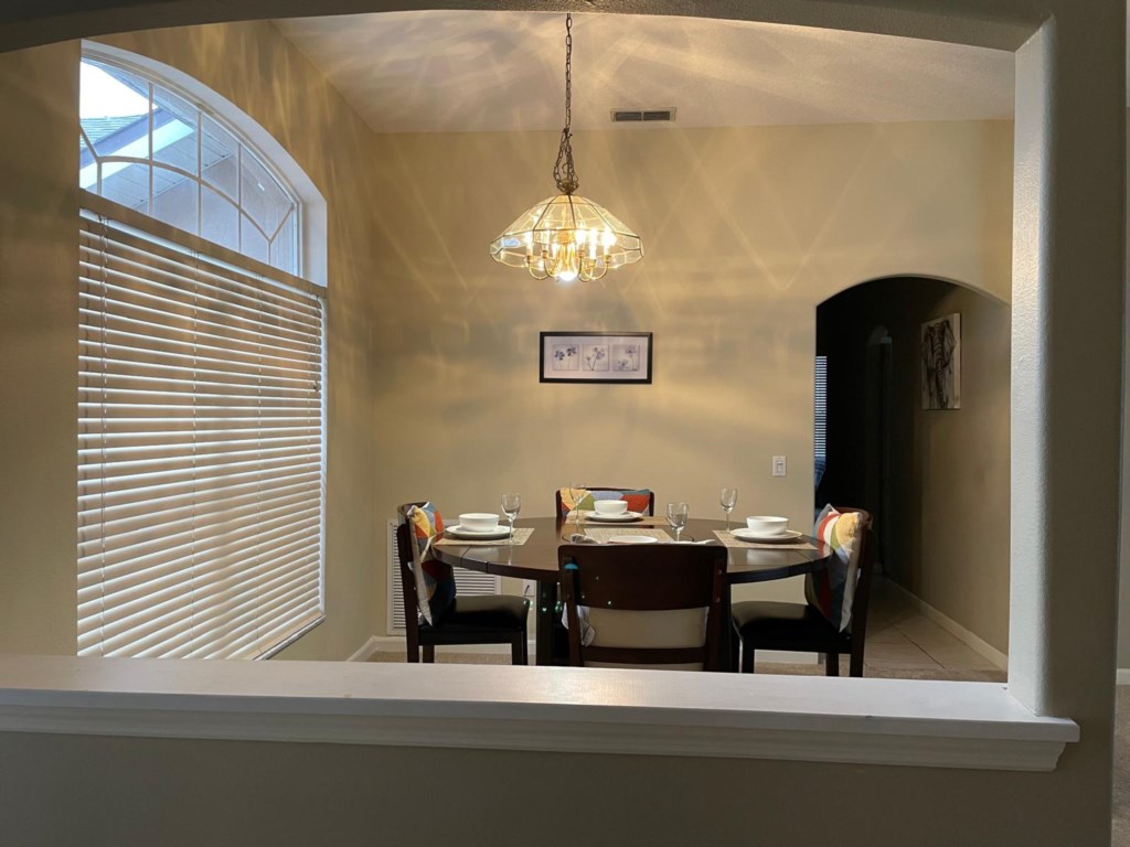 As you walk in the door the feeling of space is very apparent with the spacious formal living and dining area and its view of the blue sparkling pool outside. The large sectional sofa is ideal for sitting and relaxing after a long day out and about in Orlando and the surrounding countryside. There is a formal dining table with 4 chairs in this area.